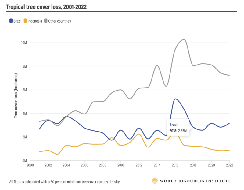 Mais d’après le Global Forest Watch, les chiffres sont différents: la perte de couvert forestier aurait augmenté récemment, et non diminué (13 Millions d’hectares en 2001 et 28 Millions d’hectares en 2023). Les tropiques auraient perdu 12 millions d’hectares de couvert forestier en 2022. Particulièrement inquiétant, 3,7 millions d’hectares déforestés se trouvent dans les forêts primaires.
